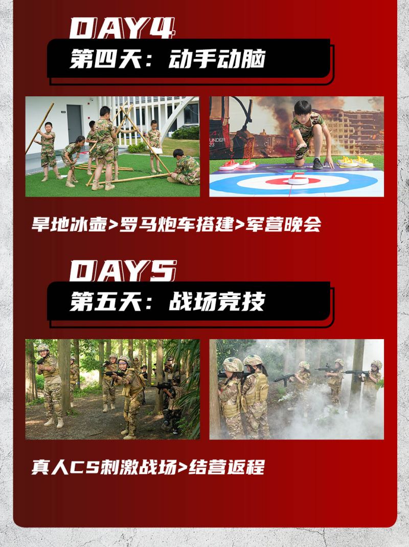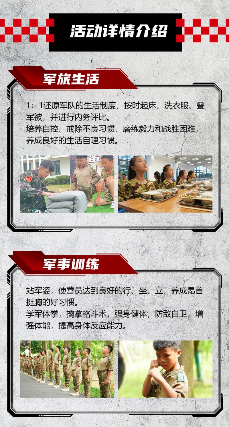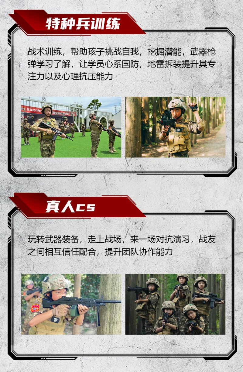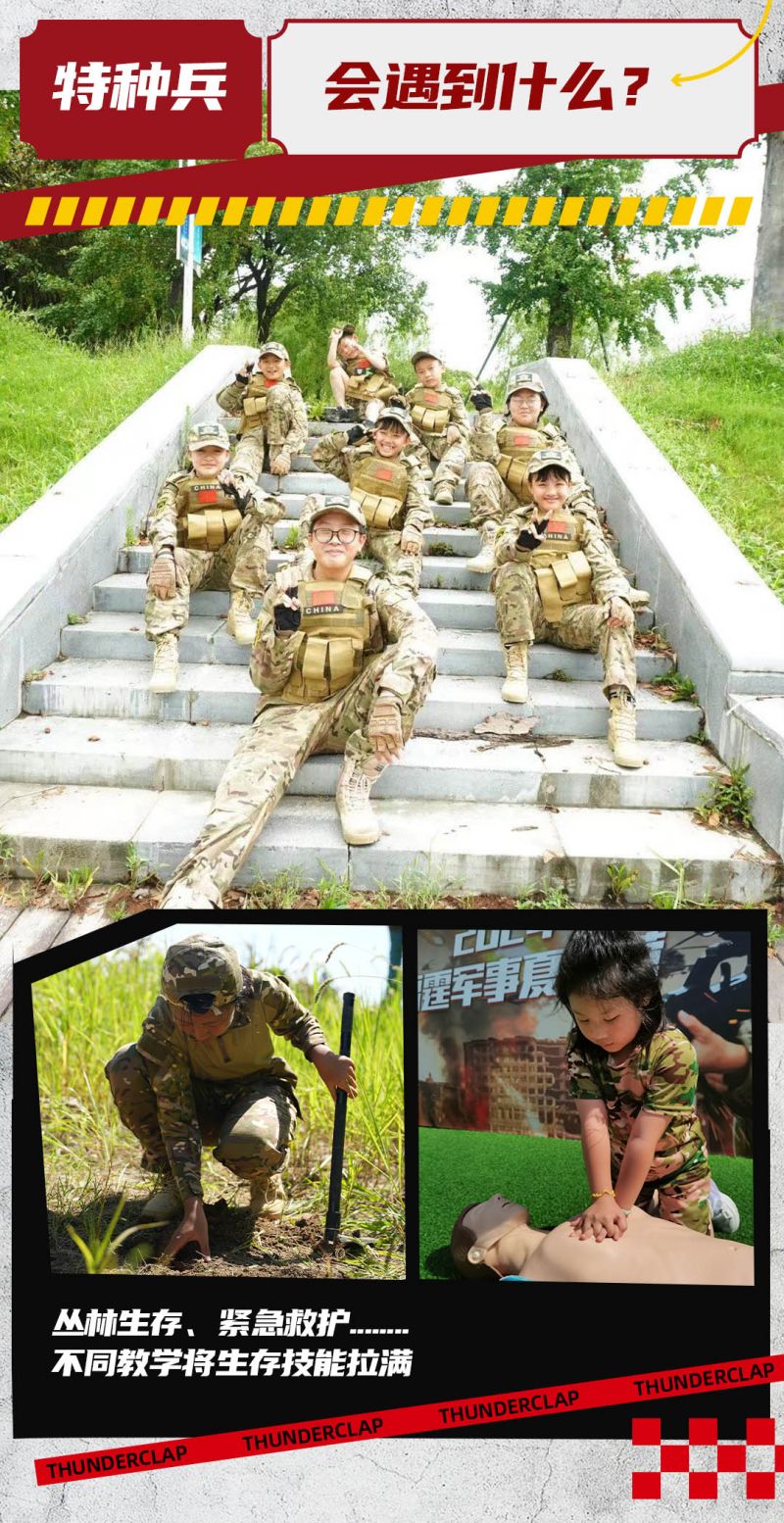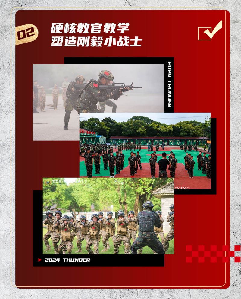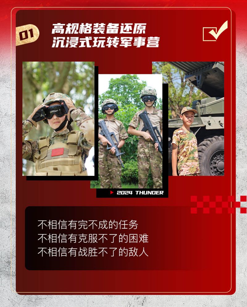 高规格装备还原,沉浸式玩转军事营,硬核教官教学,塑造刚毅小战士,高规格升旗仪式/授勋仪式/结营仪式/让小战士们肩扛责任收获满满......