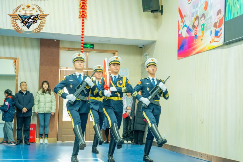 升旗仪式开始了,教官们昂首挺胸,迈着铿锵有力的步伐,护卫着鲜艳的五星红旗入场。