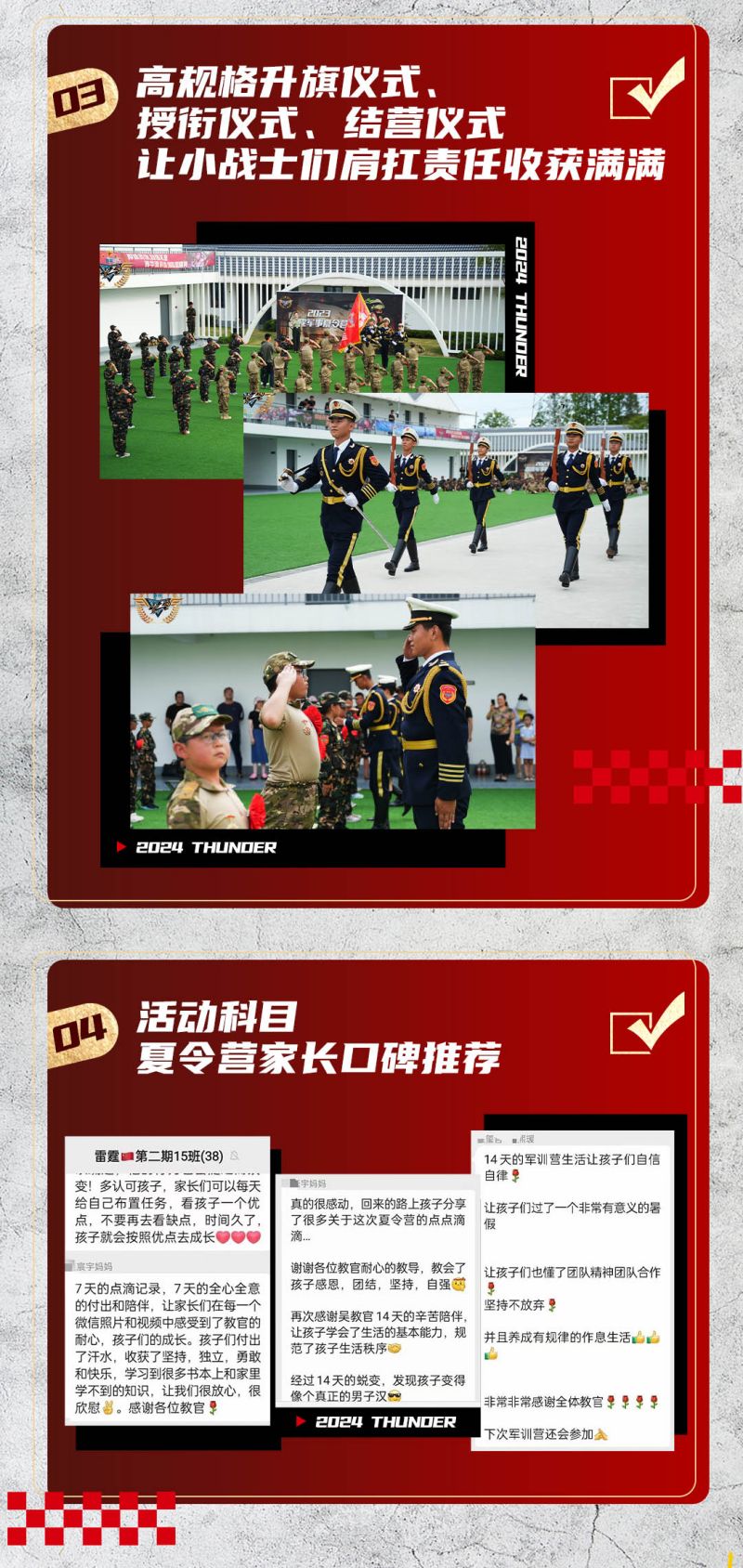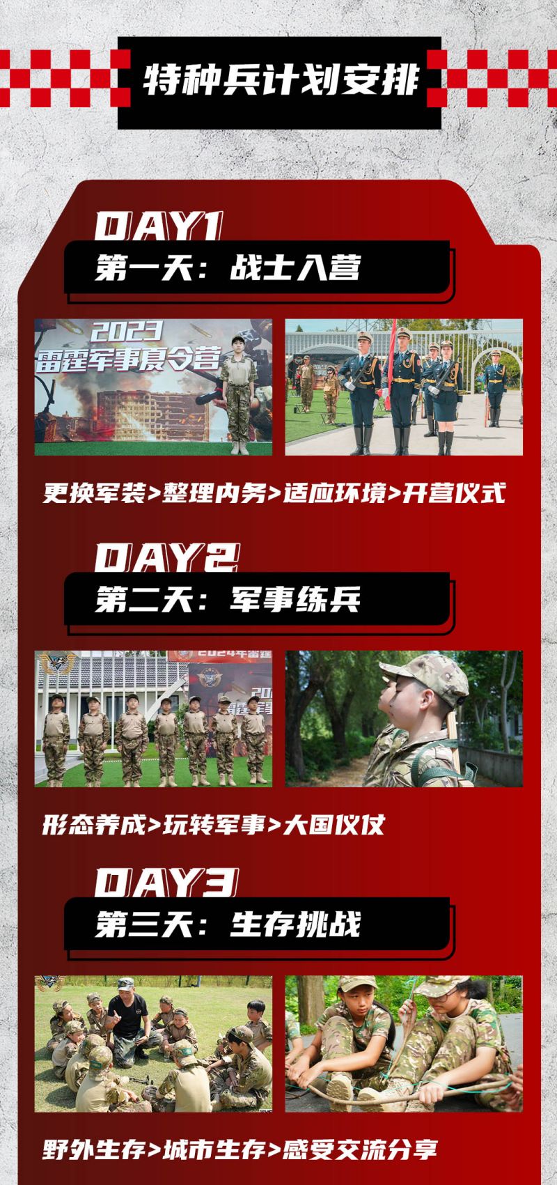 行程特色:高规格装备还原,沉浸式玩转军事营,硬核教官教学,塑造刚毅小战士,高规格升旗仪式/授勋仪式/结营仪式/让小战士们肩扛责任收获满满......