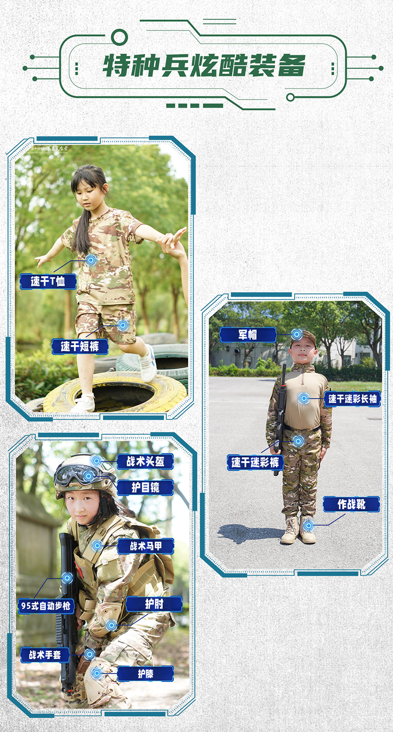 行程特色:让孩子来到军营体验军人的生活作息,学习军人身上的优良品质,明白自己身为国人独有的骄傲与自豪
